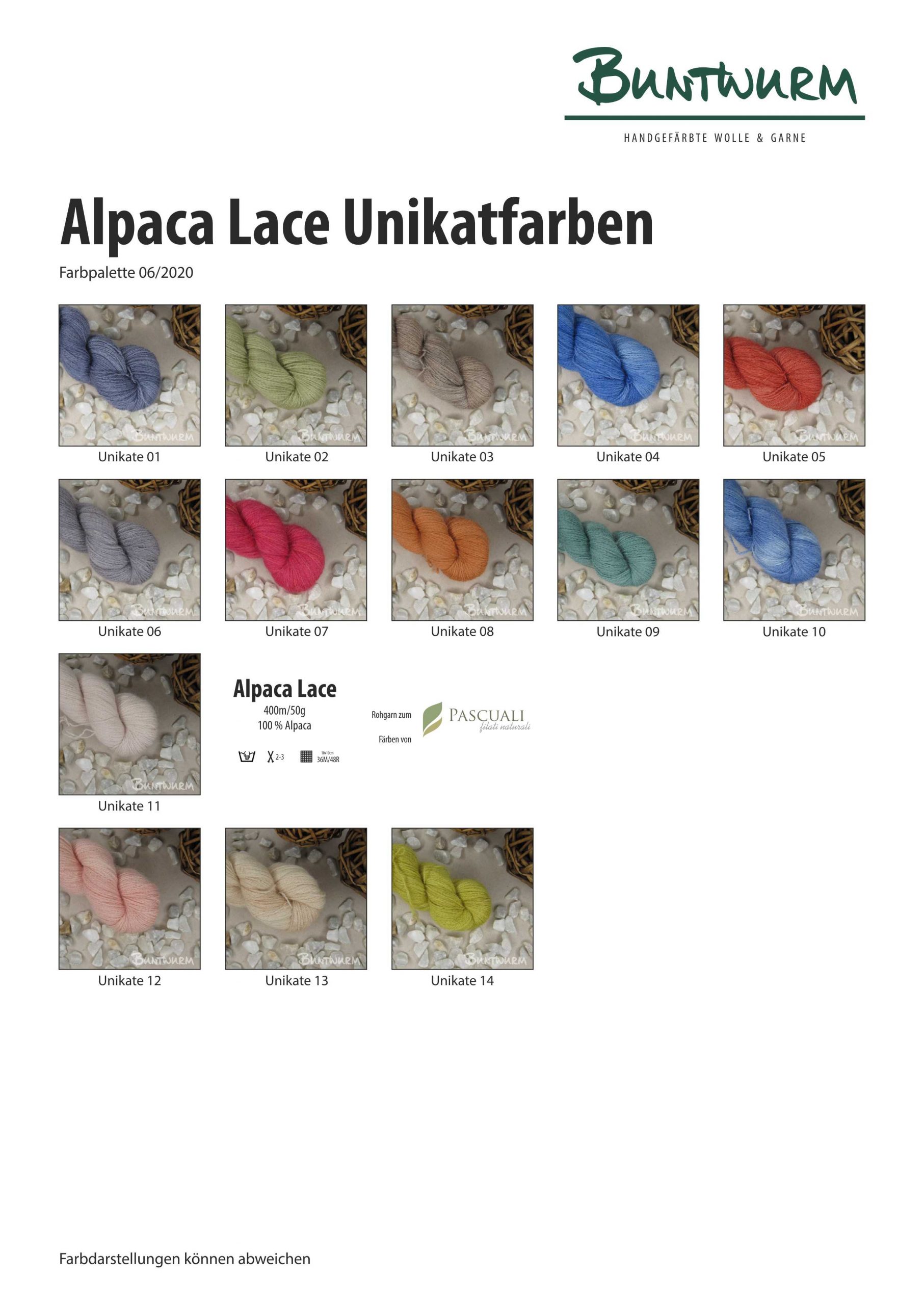 Die Überraschungstüte besteht aus 500g Alpaca Lace. Ich stelle deine Tüte aus 50 und 100g-Strängen zusammen.